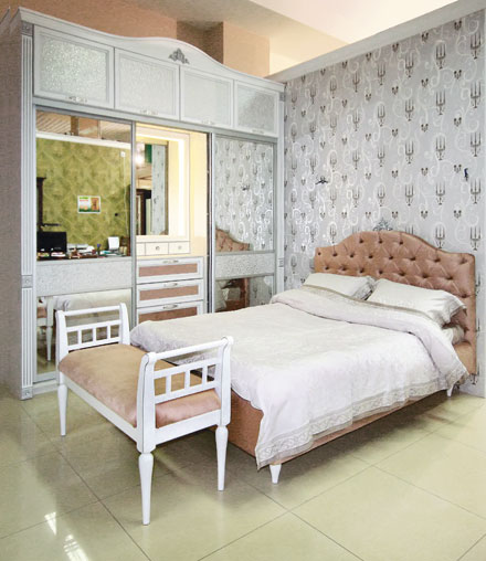 Фасады шкафа-купе выполнены из массива сосны со вставками из декоративной искусственной кожи. Кровать имеет мягкую обвязку и изысканное изголовье. Комод, прикроватную тумбу и другие элементы мебели можно заказать дополнительно.