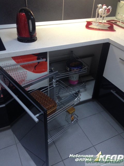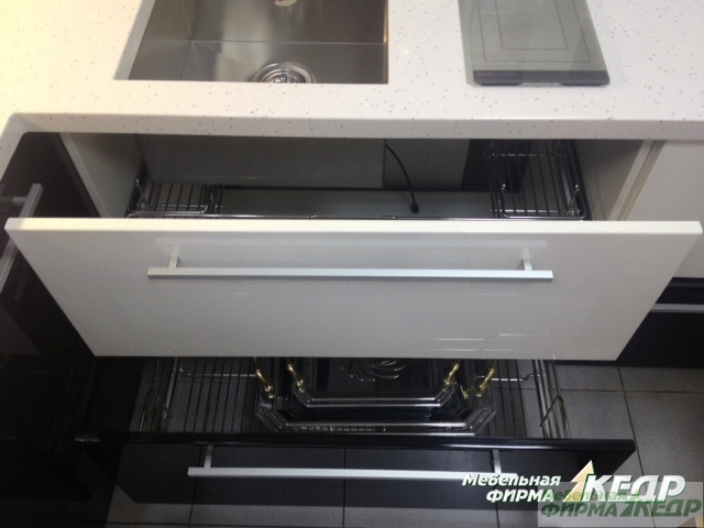 В комплект входит: — столешница искусственный камень Гетакор (Германия), — мойки Тека подстольного монтажа (Германия) 2 шт., — разделочная доска к мойкам, — фасады глянцевые МДФ, — подъемники Авентос, — сетки под мойкой, 2 шт. — выкатные ящики с доводчиками Blum (Австрия), 6 шт., — барная стойка из шпона.