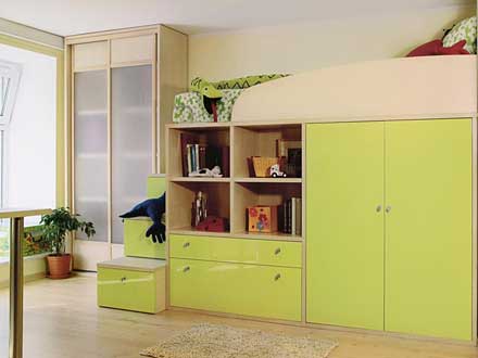 Такая компоновка мебели в детской позволяет разместить кровать и большое количество мест для хранения вещей – шкафов, ящиков, полок – на довольно ограниченном пространстве. А возможность спать на «втором этаже» понравится и «юному пирату», и «маленькой фее». Для безопасности кровать снабжена специальным ограничителем. Корпуса шкафов, кровати и «лесенки» из выдвижных ящиков – декор «Береза», распашные фасады шкафа и фасады выдвижных ящиков - высокоглянцевая эмаль «Лайм». Все фасады снабжены ручками «стандарт».Шкаф у окна - комбо-двери системы «Арредо»: декор «Береза» и плексиглас «Белый лед».