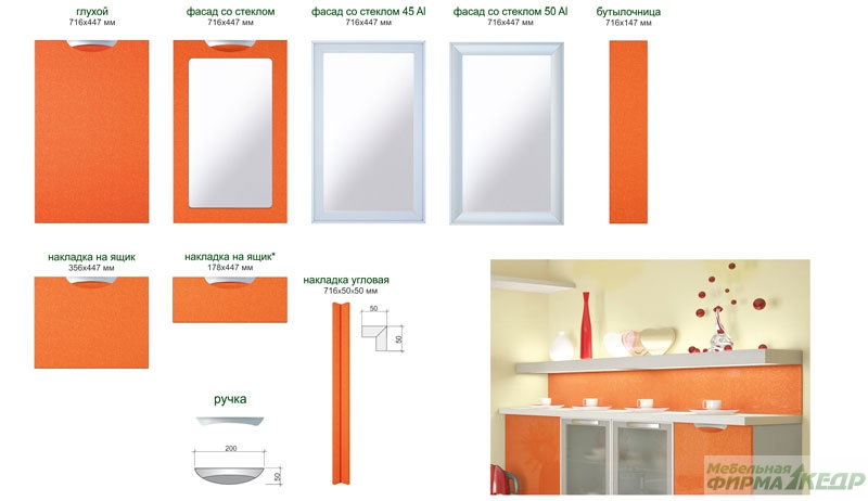 Для моделей «Палермо» и «Вена» представлена широкая цветовая гамма от ярких локальных до пастельных тонов, фантазийные и металлизированные декоры, с эффектом «3D». Декоры можно использовать как самостоятельно, так и комбинировать. Врезная алюминиевая ручка на фасаде, как и стекло в алюминиевом профиле являются неотъемлемой частью композиции этих моделей и гармонично сочетаются с другими хромированными элементами и аксессуарами на кухне.