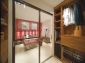 Оригинальная гардеробная с двух сторон отделена от остального жилого пространства раздвижными дверями «Нотеборн 55». Декор стеллажей — «Вишня Портланд». В центральной части расположены по два вешала-лифта «Онли». Стеллаж снабжен открытыми полками, выдвижными ящиками с ручками-скобами «Эхо» и различными элементами серии «Хромос»: выдвижными держателями для гастуков, откидными решетками и выдвижными корзинами для аксессуаров, выдвижной решеткой для брюк и держателями для обуви.