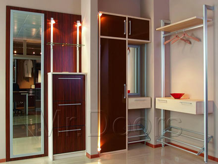 | Зеркальная стойка: две фальш-стойки «Лофт» со светильниками «Амбрелла» и стеклянными полочками. Зеркало в раме «Джамп». Корпуса ящиков выполнены в цвете «Капуччино». Фасады и задняя стенка – декор «Палисандр». Встроенный в нишу шкаф с распашными фасадами: корпус «Дуб Кремона», дверки в высоком глянце цвета «Орех», светильник «Амбрелла». Стойки «Лофт» с обувными полками и навесными ящиками в декоре «Кремона». |