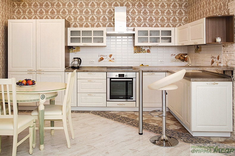 Кухонный гарнитур неоклассика по цене от 28 000 р. за п.м. Кухни от фирмы «Кедр» всегда индивидуальны, креативны, полны ярких красок и полностью соответствуют вкусу владельцев.