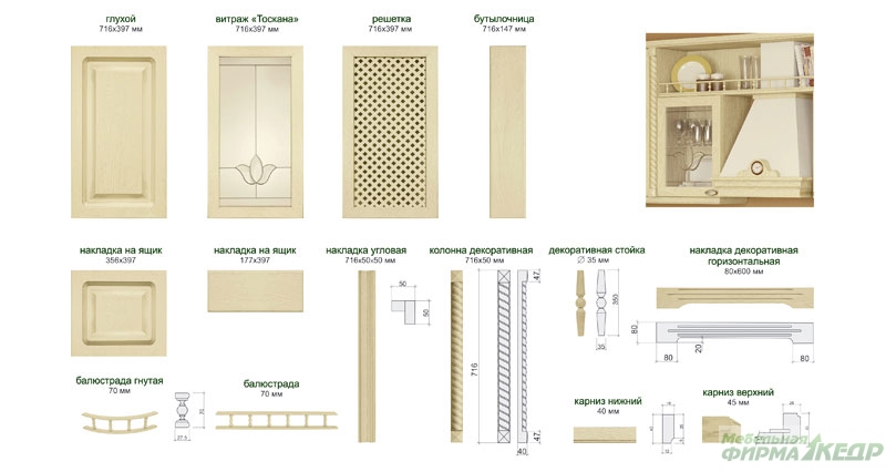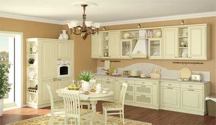 Контуры и изгибы модели «Тоскана» служат образцом классической мебели, они лишены избыточно сложной фрезеровки фасадных панелей и смелых цветовых решений. Умело нанесенная золотая патина придает гарнитуру изысканность. Светлая тонировка, классическая архитектура, прекрасное сочетание фасадной части и внутреннего наполнения делают этот вариант очень популярным.