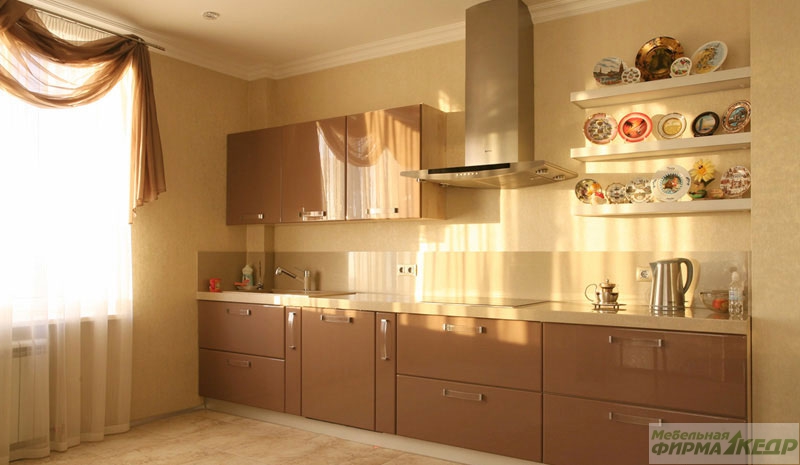 Использование для фасадов кухонного гарнитура высокоглянцевой пленки ПВХ — это просто «кладезь» для дизайнерских идей: широкая цветовая гамма от ярких локальных до пастельных тонов, древесные, фантазийные и металлизированные декоры, с эффектом «3D». Декоры можно использовать как самостоятельно, так и комбинировать. Фасады из высокоглянцевой пленки гармонично сочетаются с натуральными шпонированными покрытиями, как глянцевыми, так и матовыми алюминиевыми аксессуарами. Полупрозрачное стекло увеличивает эстетическую привлекательность кухни, привнося в интерьер легкость и воздушность.